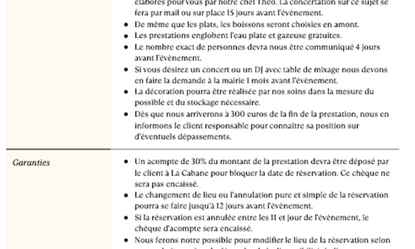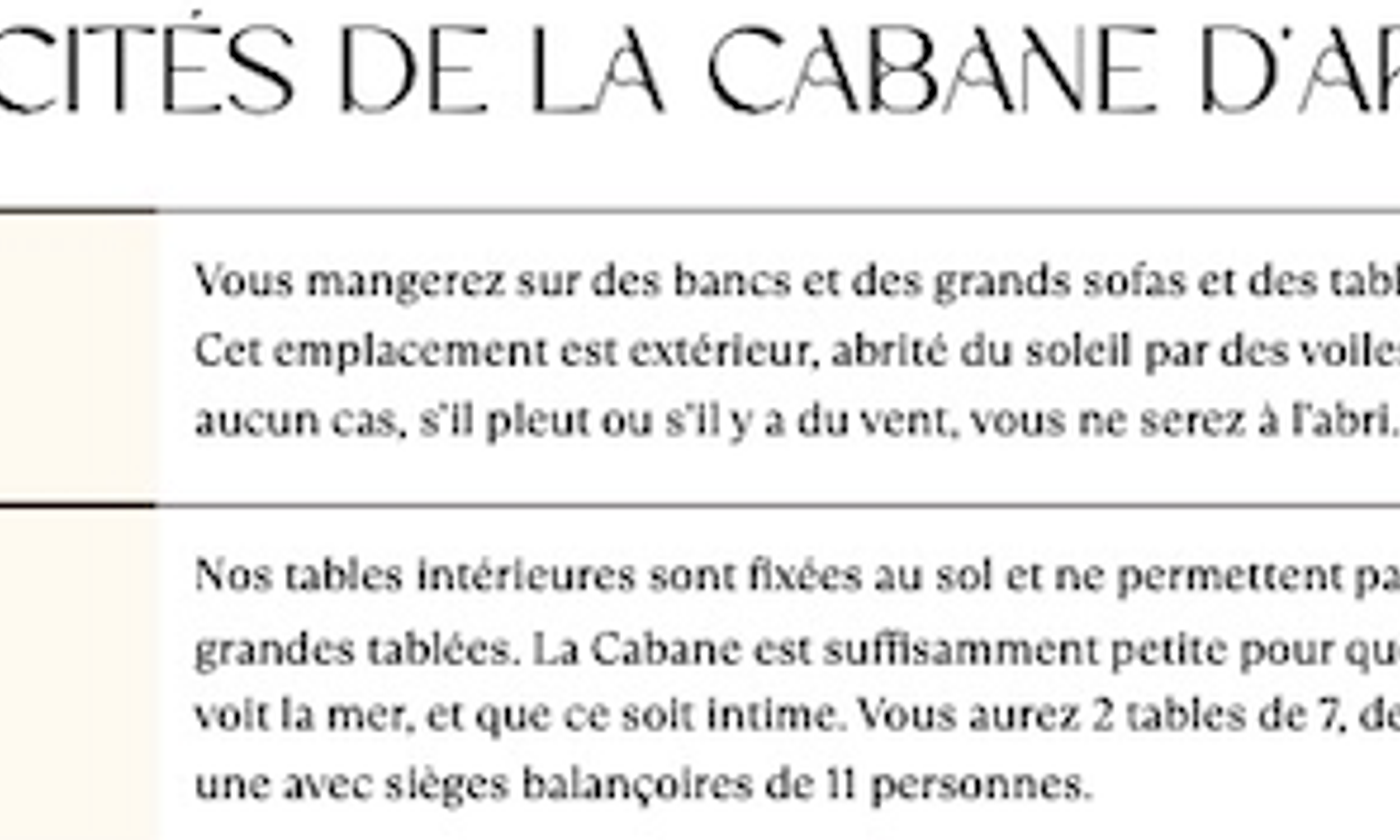 Vous avez la possibilité de privatiser la Cabane, pour tout ou partie du service. Nous proposons des offres variées (cocktail, menu unique, menu au choix, etc...). Nos tarifs s'entendent boissons et nourritures inclues et ne sont pas liées au nombre de personnes mais à l'espace et à la durée de votre privatisation. Pour nous contacter, merci de cliquer sur l'onglet "privatiser"